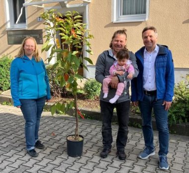 Bürgermeister Karl Kolb überreicht Tina und Osman Özer einen Kirschbaum für Tochter Selina.