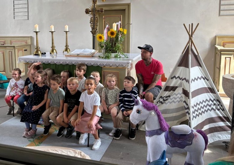 Der Festtag begann mit einem stimmungsvollen Gottesdienst, in dem die Kinder die Geschichte vom neuen Spielplatz und vom Umbau der Gruppe erzählten. Mit Dankesworten und Gebeten, Liedern sowie einem Tanz haben sie ihre Freude darüber zum Ausdruck gebracht.