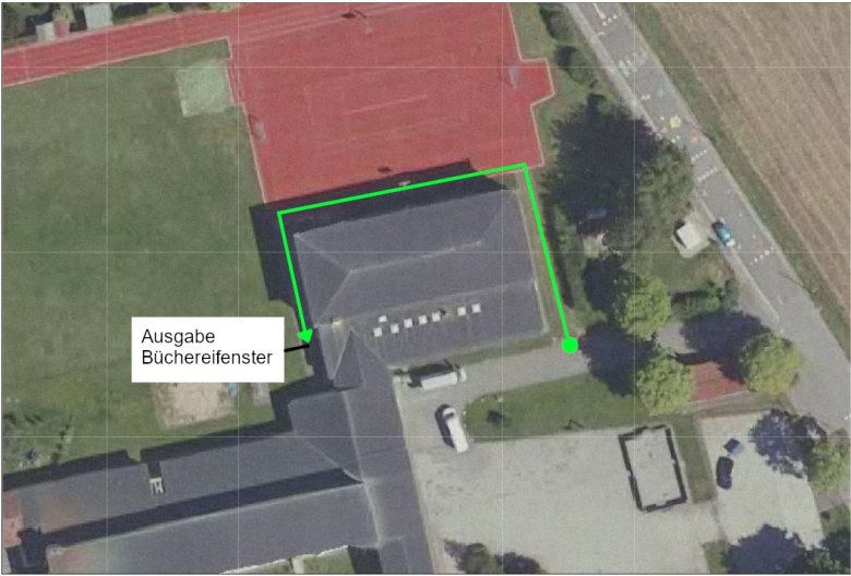 Die Bücherrückgabe bzw. Bücherausgabe ist allerdings nur über das Büchereifenster möglich. Bitte beachten Sie die beigefügte Skizze bzw. die Ausschilderung.